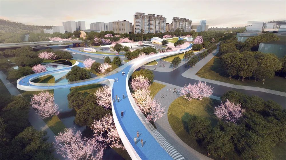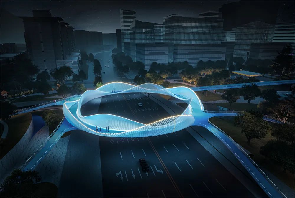 設(shè)計(jì)環(huán)形人行天橋,猶如一朵盛開的嬌艷的花,有機(jī)聯(lián)系起項(xiàng)目的南北地塊,同時(shí)兼顧新區(qū) 大道的人行過街功能,結(jié)合燈光藝術(shù)營造,也將成為該片區(qū)一個(gè)標(biāo)志性的打卡點(diǎn),象征著雅安因多樣而美麗,因共生而繁盛;颦h(huán)圍欄展示雅安特色物種。地面燈光按植物花色進(jìn)行分段布置,同時(shí)通過投影設(shè)備和交互式燈光等設(shè)施,增加游人體驗(yàn)感。環(huán)形橋跨越機(jī)動(dòng)車道,基因環(huán)的出現(xiàn)開始了生物密碼的探索之旅。