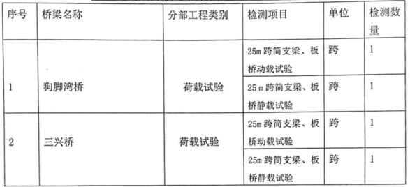 2.項(xiàng)目?jī)?nèi)容:對(duì)碧峰峽路下段道路狗腳灣橋、三興橋進(jìn)行動(dòng)、靜荷載試驗(yàn)。