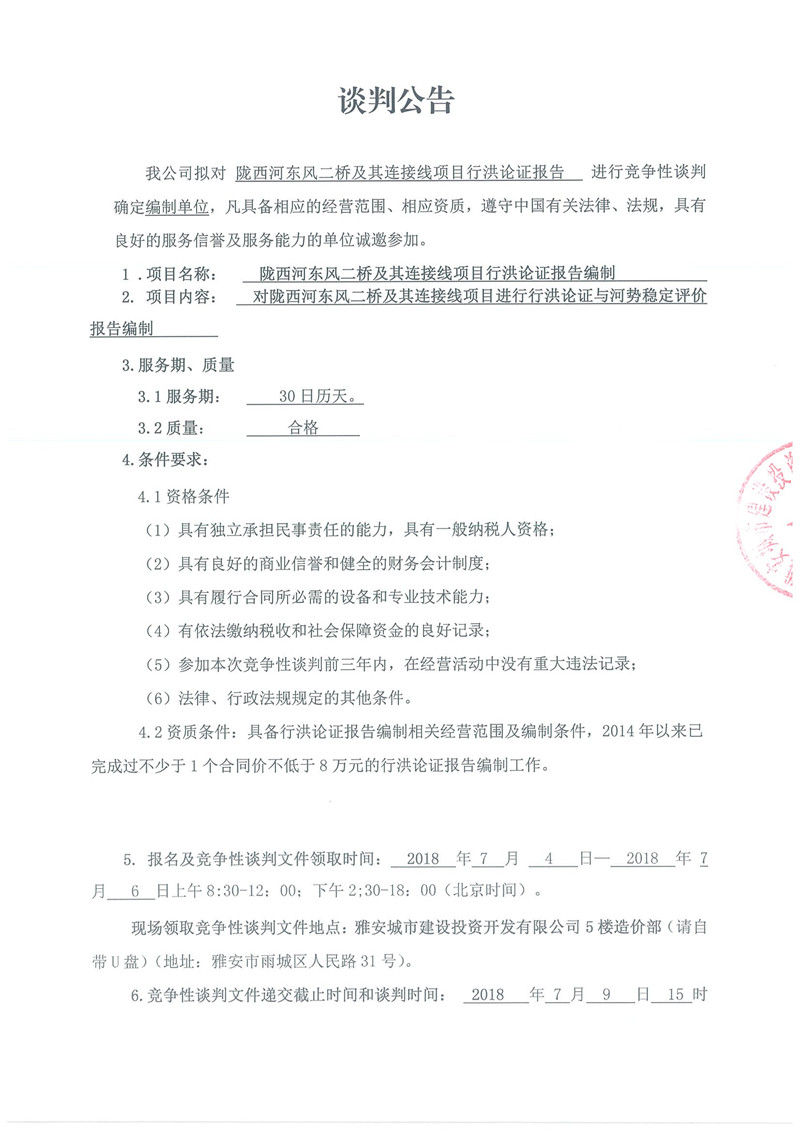 隴西河?xùn)|風(fēng)二橋及其連接線項目行洪論證報告編制的競爭性談判公告