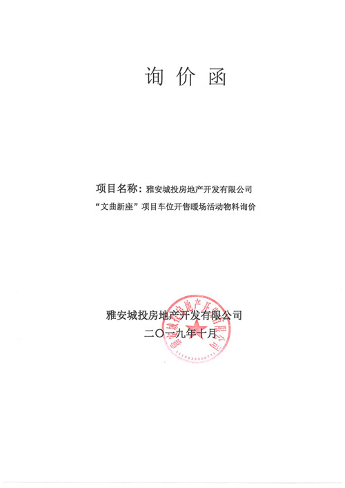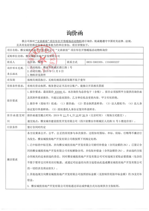 雅安城投房地產(chǎn)開發(fā)有限公司“文曲新座”項目車位開售暖場活動物料詢價函