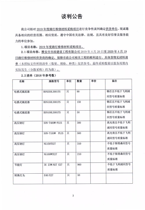 市政公司2019年度路燈維修材料采購項(xiàng)目競爭性談判公告