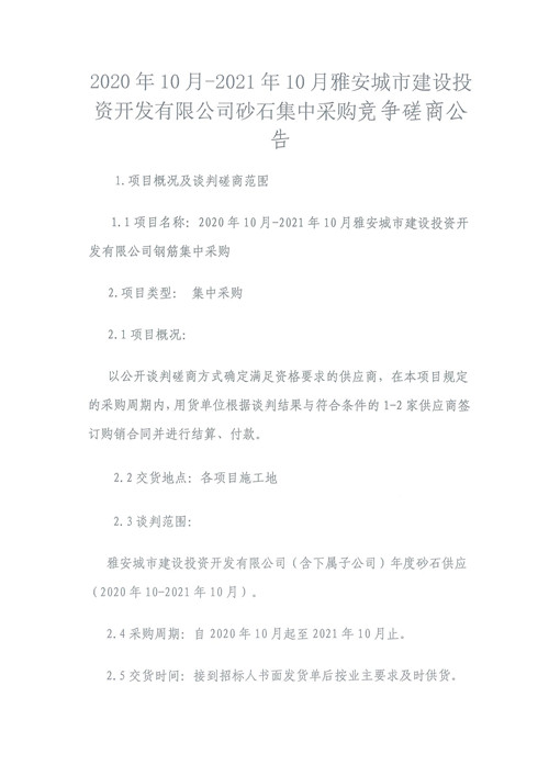 2020年10月-2021年10月雅安城市建設(shè)投資開發(fā)有限公司砂石集中采購競爭磋商公告
