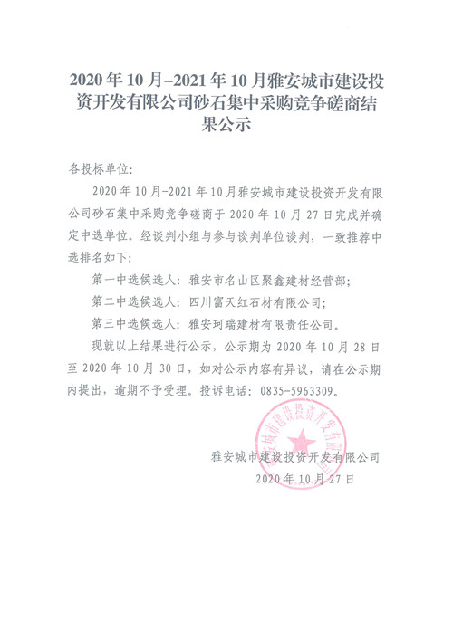 2020年10月-2021年10月雅安城市建設(shè)投資開發(fā)有限公司砂石集中采購競(jìng)爭(zhēng)磋商結(jié)果公示