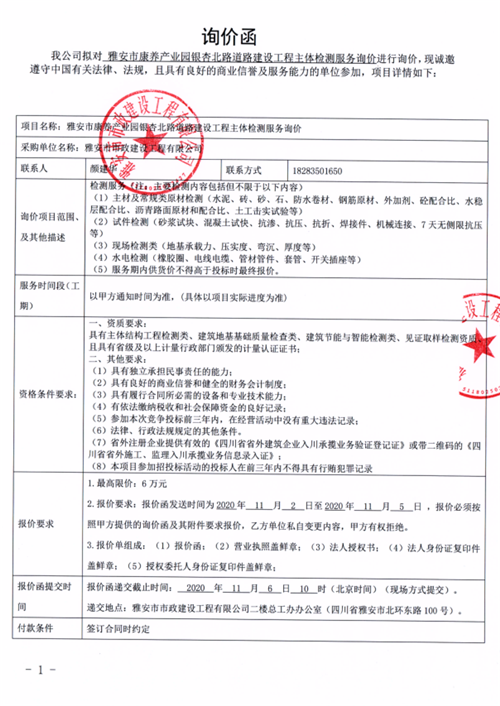 雅安市康養(yǎng)產(chǎn)業(yè)園銀杏北路道路建設(shè)工程主體檢測服務(wù)詢價(jià)函