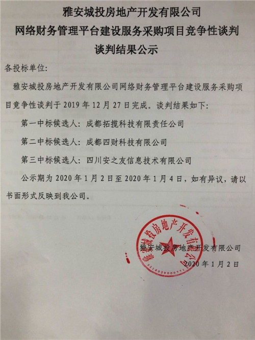 雅安城投房地產(chǎn)開發(fā)有限公司網(wǎng)絡(luò)財(cái)務(wù)管理平臺(tái)建設(shè)服務(wù)采購項(xiàng)目競爭性談判結(jié)果公司
