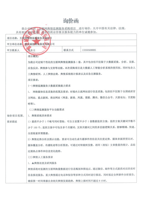 城投物業(yè)公司互聯(lián)網(wǎng)輿情監(jiān)測(cè)服務(wù)采購(gòu)項(xiàng)目詢(xún)價(jià)函