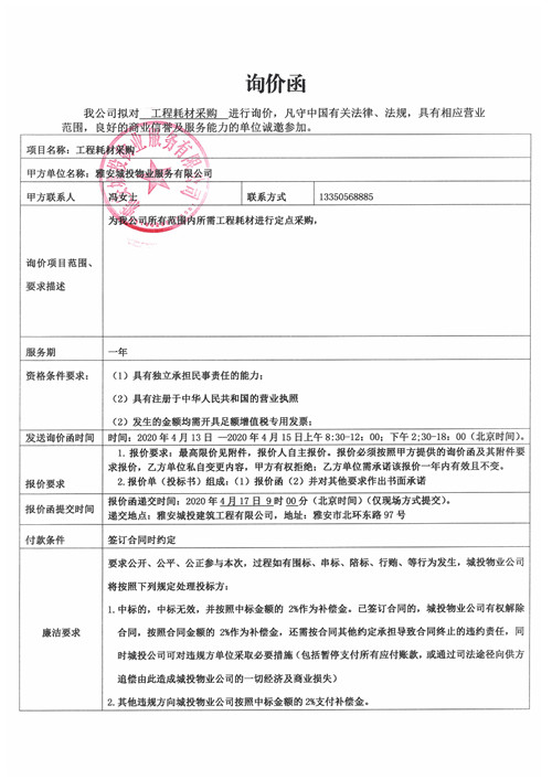 城投物業(yè)公司工程耗材采購(gòu)詢價(jià)函(第二次)
