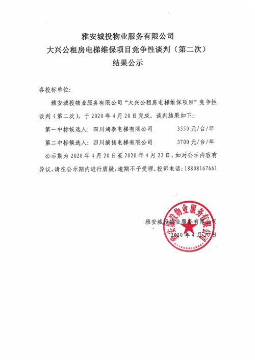 城投物業(yè)公司大興公租房電梯維保項(xiàng)目競爭性談判(第二次)結(jié)果公示