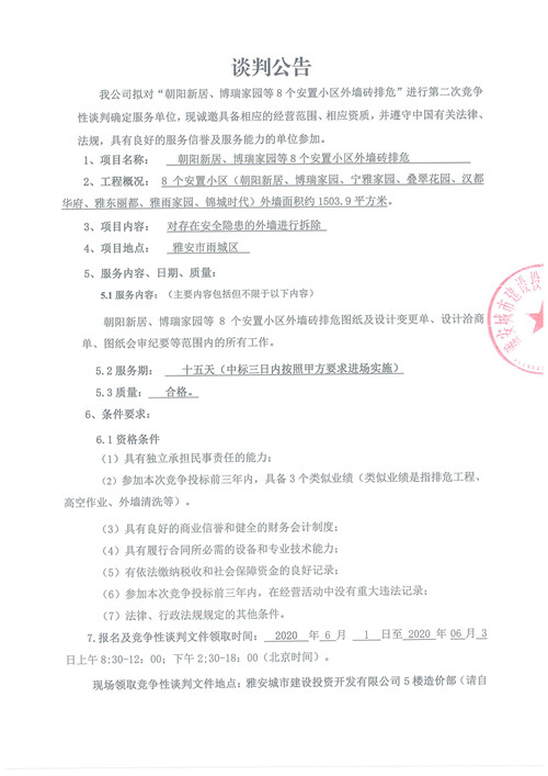城投公司“朝陽新居、博瑞家園等8個(gè)安置小區(qū)外墻磚排!备(jìng)爭(zhēng)性談判公告(第二次)