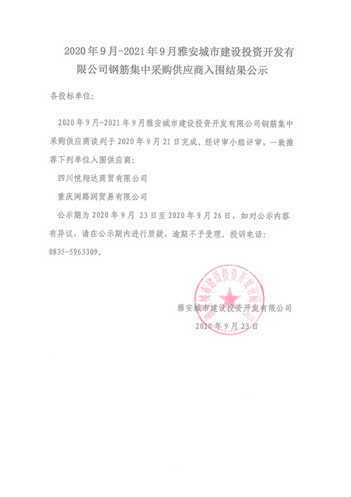 2020年9月-2021年9月雅安城市建設(shè)投資開發(fā)有限公司鋼筋集中采購(gòu)供應(yīng)商入圍結(jié)果公示