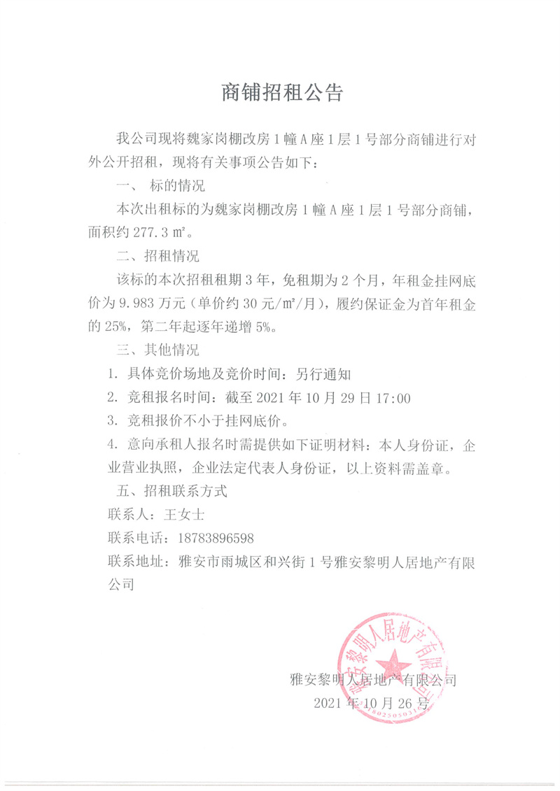 魏家崗棚改房1幢A座1層1號部分商鋪招租公告