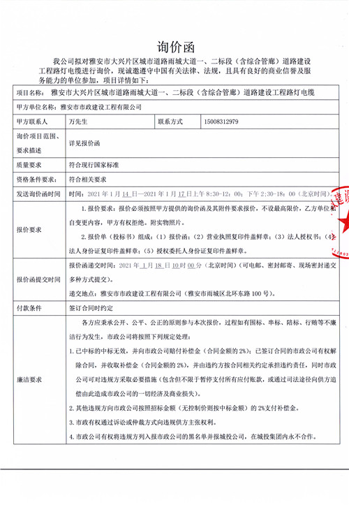 雅安市大興片區(qū)城市道路雨城大道一、二標(biāo)段(含綜合管廊)道路建設(shè)工程路燈電纜詢價(jià)函