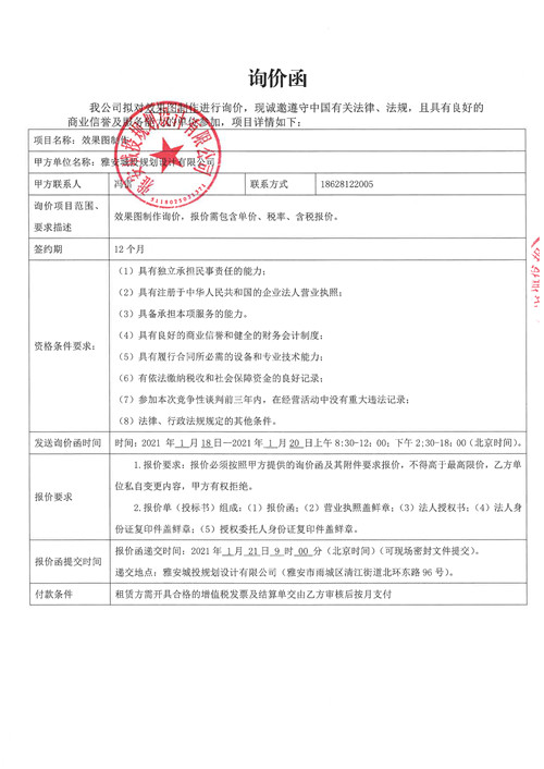 雅安城投規(guī)劃設(shè)計(jì)有限公司效果圖制作服務(wù)詢價(jià)函