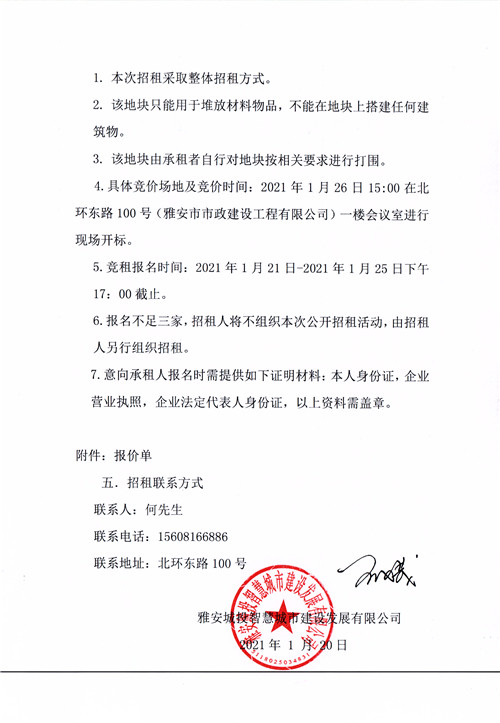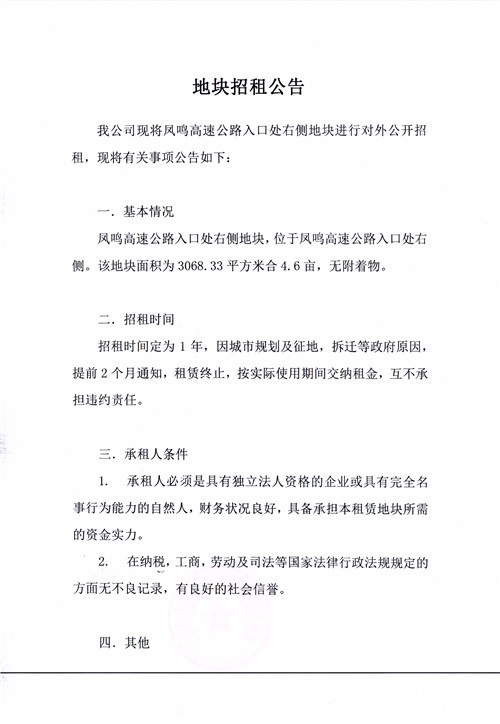 雅安市市政建設(shè)工程有限公司鳳鳴高速公路入口處右側(cè)地塊招租公告