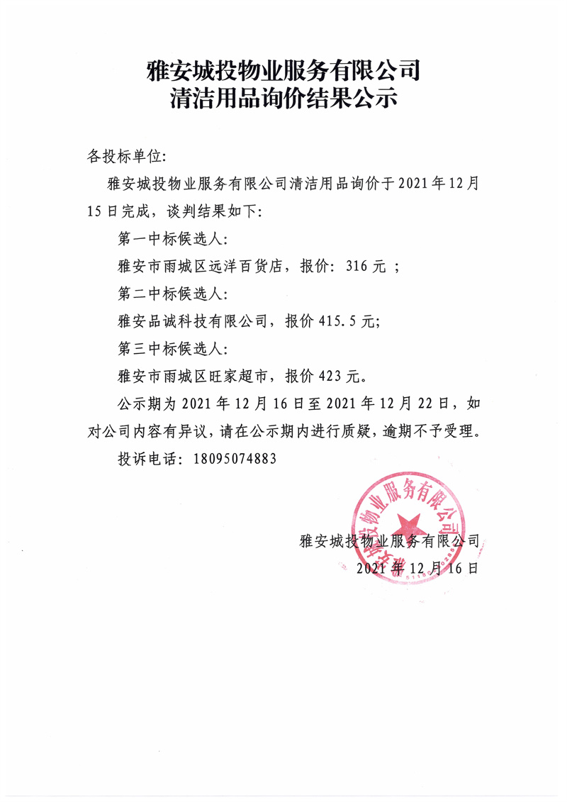 雅安城投物業(yè)服務(wù)有限公司清潔用品詢(xún)價(jià)結(jié)果公示