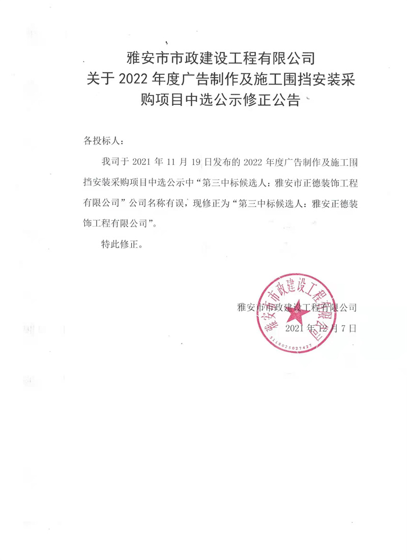 雅安市市政建設(shè)工程有限公司2022年度廣告制作及施工圍擋安裝采購項目中選公示修正公告