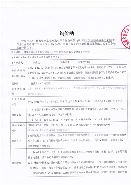 城利水電公司供電所35kV真空斷路器手車采購(gòu)詢價(jià)函