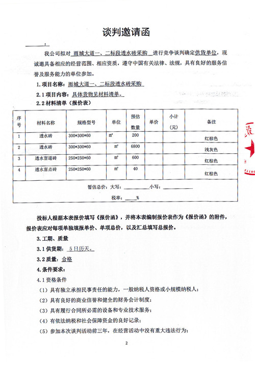 市政公司雨城大道一、二標(biāo)段透水磚采購競(jìng)爭(zhēng)性談判公告