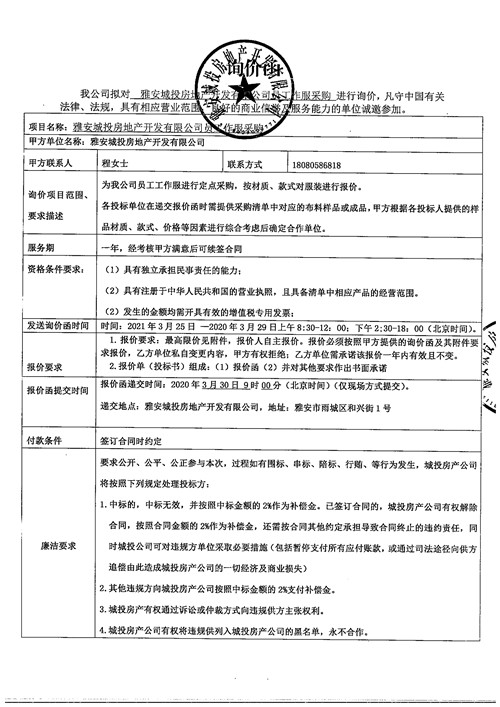 城投地產(chǎn)公司工作服采購詢價(jià)函