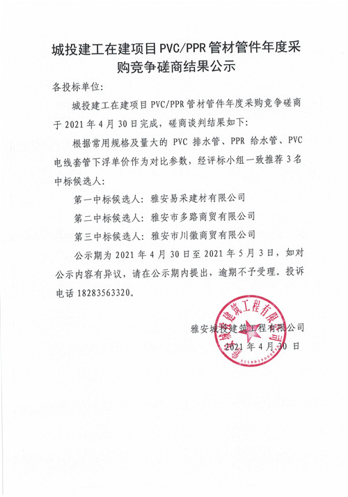 城投建工在建項(xiàng)目PVC/PPR管材年度采購(gòu)磋商結(jié)果公示