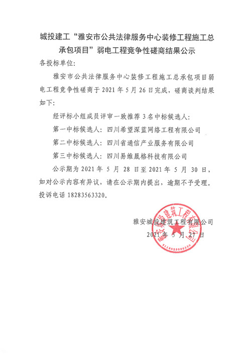 城投建工公司雅安市公共法律服務(wù)中心裝修工程施工總承包項(xiàng)目弱電工程競爭性磋商結(jié)果公示