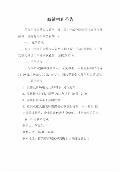 城投智慧公司穆家安置房7幢1層3號部分商鋪招租公告