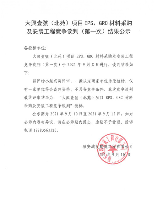大興壹號(北苑)項(xiàng)目EPS、GRC材料采購及安裝工程競爭談判結(jié)果公示