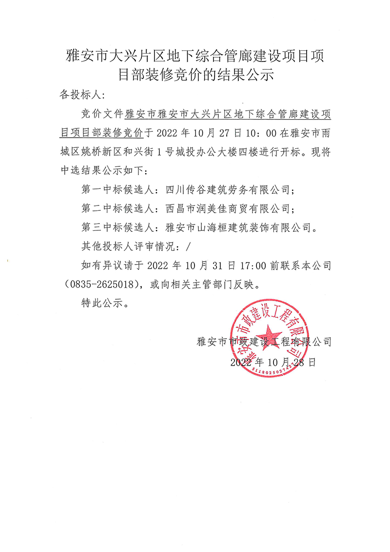 雅安市大興片區(qū)地下綜合管廊建設(shè)項(xiàng)目項(xiàng)目部裝修競(jìng)價(jià)的結(jié)果公示