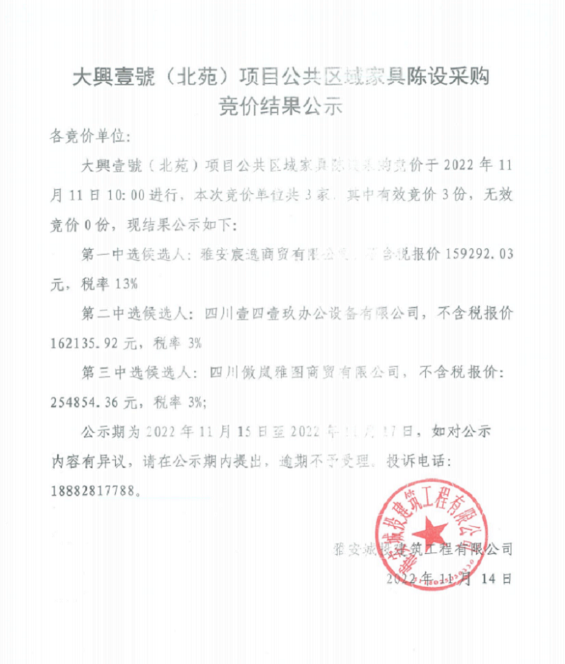 大興壹號(hào)(北苑)項(xiàng)目公共區(qū)域家具陳設(shè)采購競(jìng)價(jià)結(jié)果公示