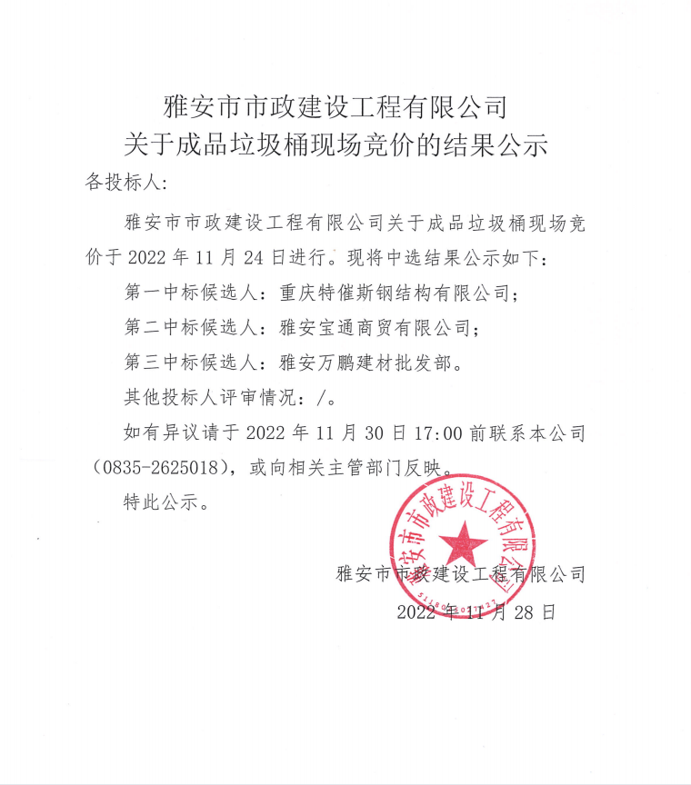 雅安市市政建設工程有限公司關于成品垃圾桶現場競價的結果公示