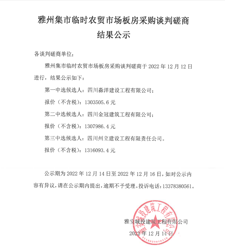 雅州集市臨時農(nóng)貿(mào)市場板房采購談判磋商結果公示