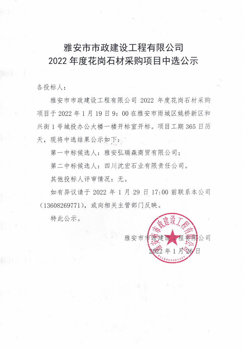雅安市市政建設工程有限公司2022年度花崗石材采購項目中選公示