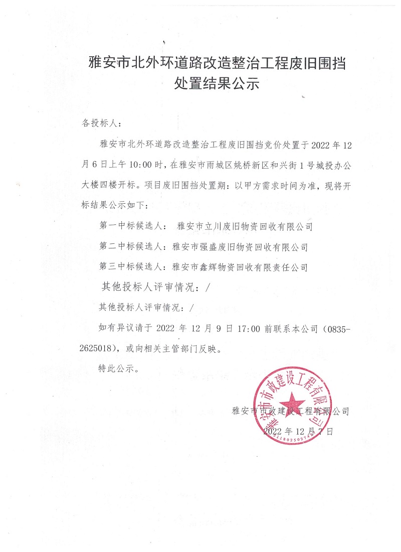 雅安市北外環(huán)道路改造整治工程廢舊圍擋處置結(jié)果公示