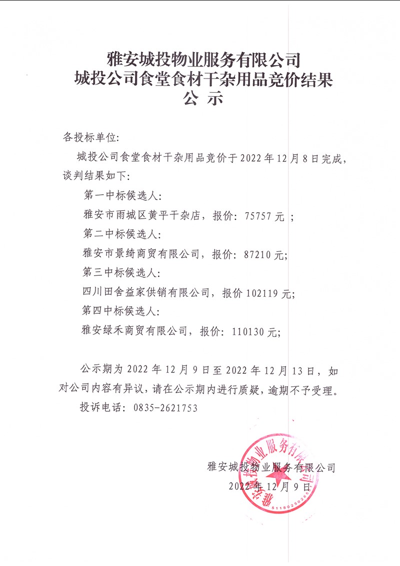雅安城投物業(yè)服務(wù)有限公司城投公司食堂干雜競價(jià)結(jié)果公示