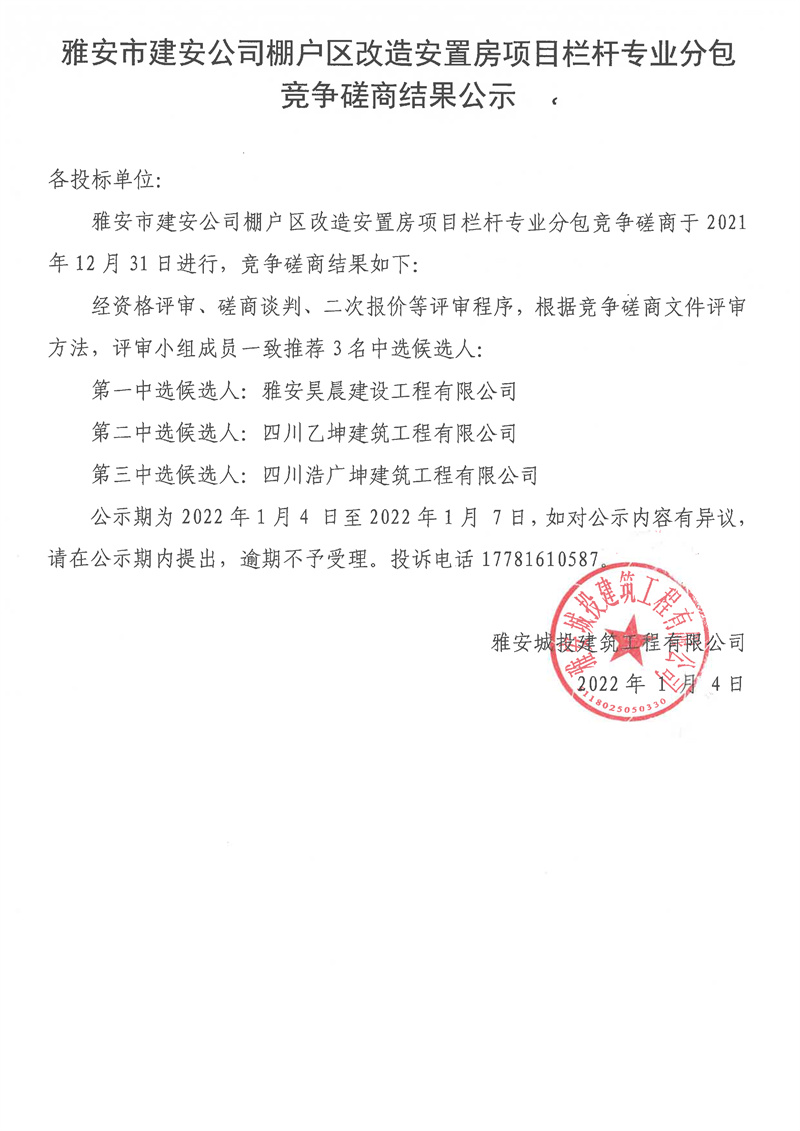 雅安市建安公司棚戶區(qū)改造安置房項(xiàng)目欄桿專業(yè)分包競爭磋商結(jié)果公示
