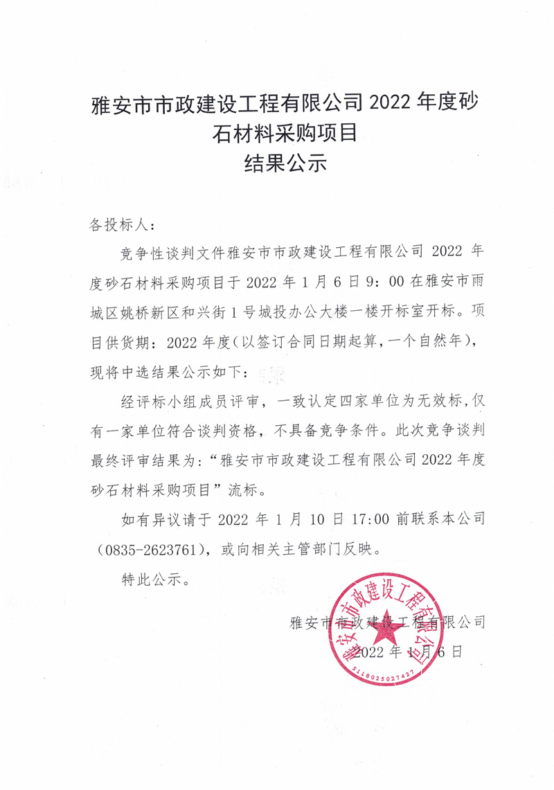 雅安市市政建設工程有限公司2022年度砂石材料采購項目結(jié)果公示