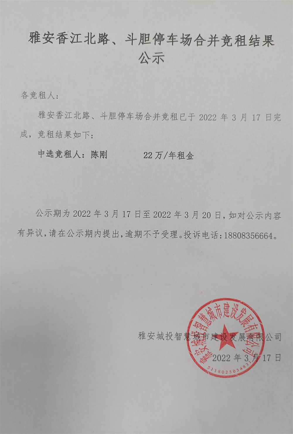 雅安香江北路停車場、斗膽停車場兩處停車場合并競租結果公示