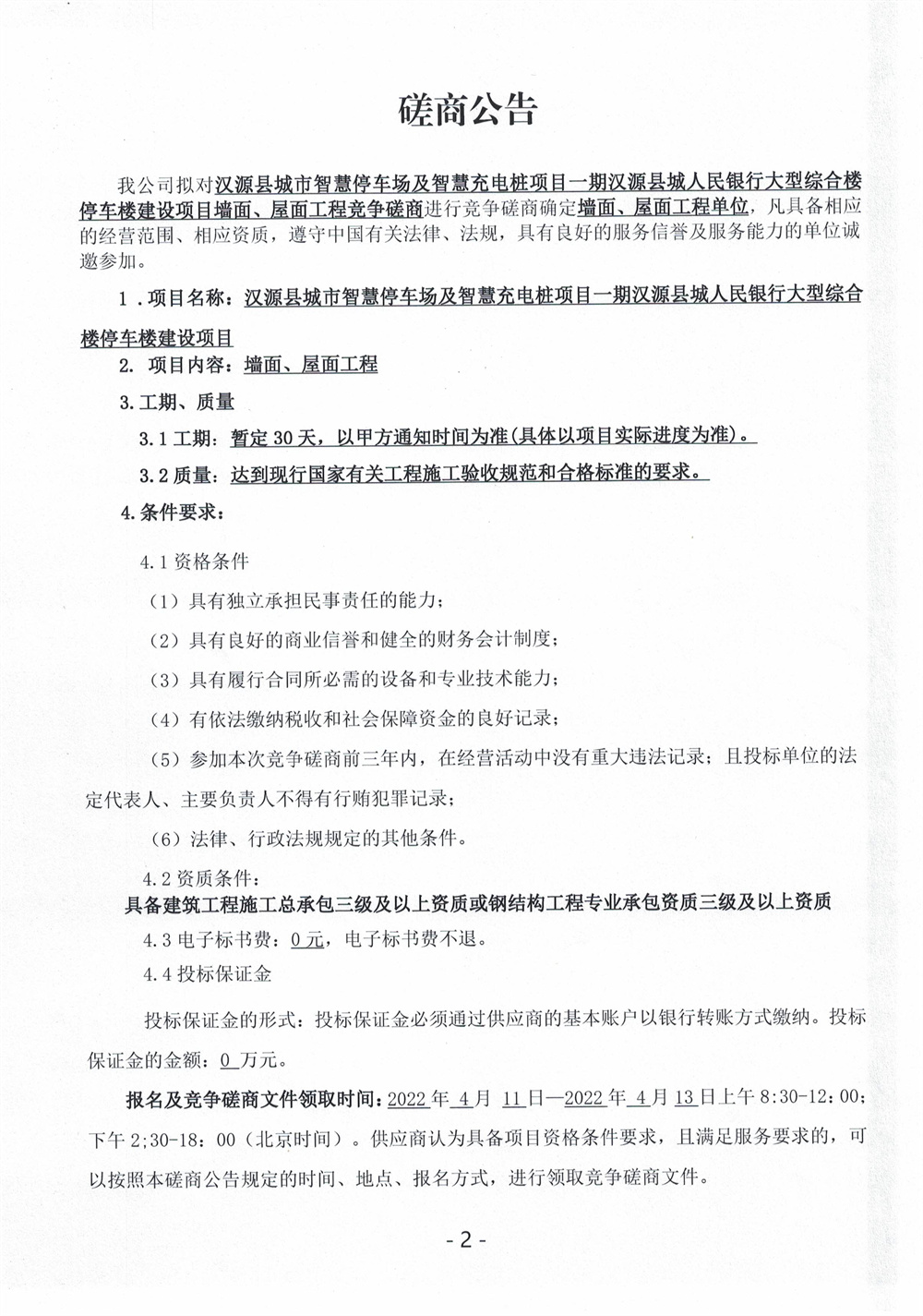 城投建工漢源縣城市智慧停車場(chǎng)及智慧充電樁項(xiàng)目一期漢源縣城人民銀行大型綜合樓停車樓建設(shè)項(xiàng)目墻面、屋面工程競(jìng)爭磋商公告