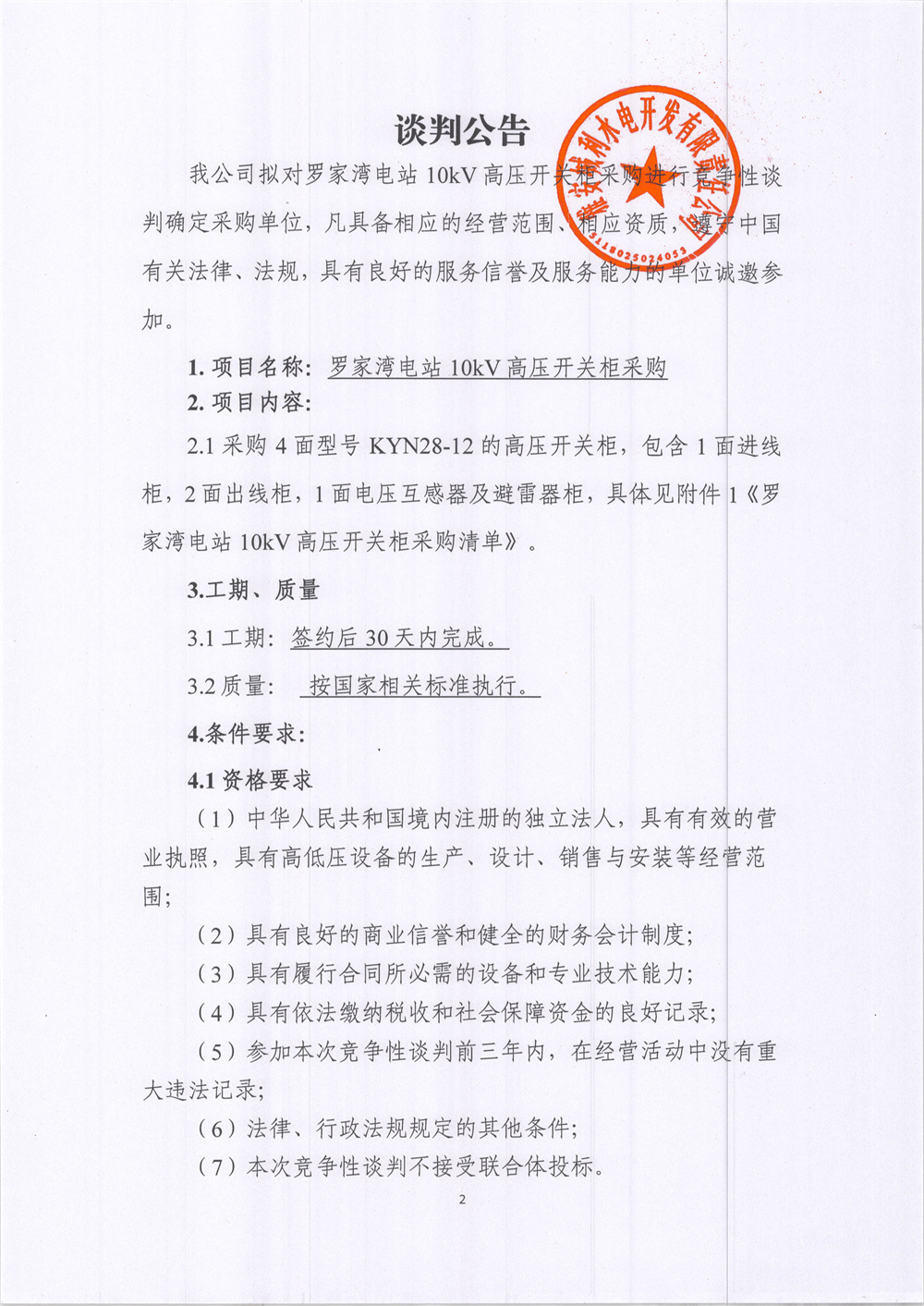 城利水電公司羅家灣電站10KV高壓開關(guān)柜柜采購(gòu)競(jìng)爭(zhēng)性談判公告