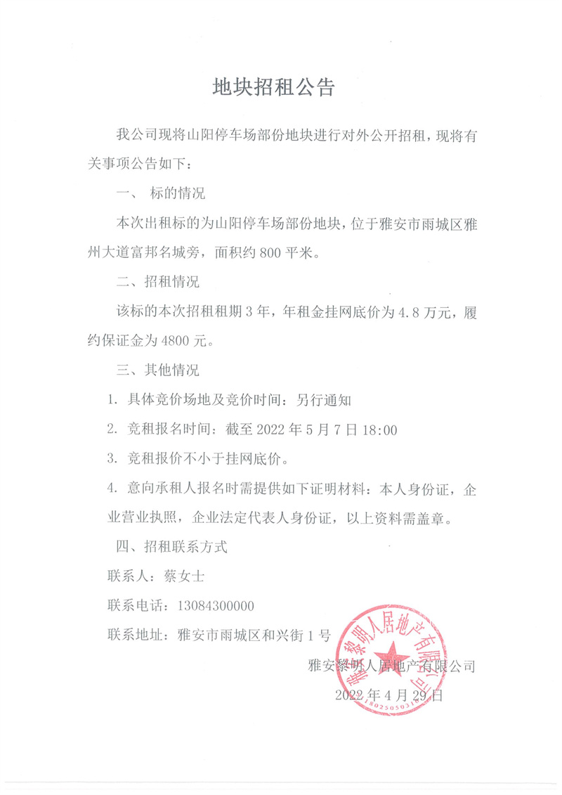 黎明人居公司山陽(yáng)停車(chē)場(chǎng)部分地塊招租公告
