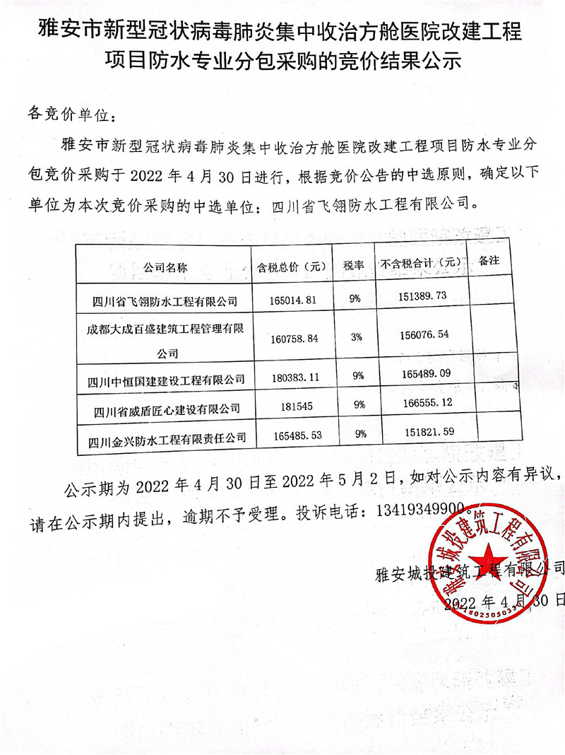 雅安市新型冠狀病毒肺炎集中收治方艙醫(yī)院改建工程項(xiàng)目防水專(zhuān)業(yè)分包采購(gòu)的競(jìng)價(jià)結(jié)果公示