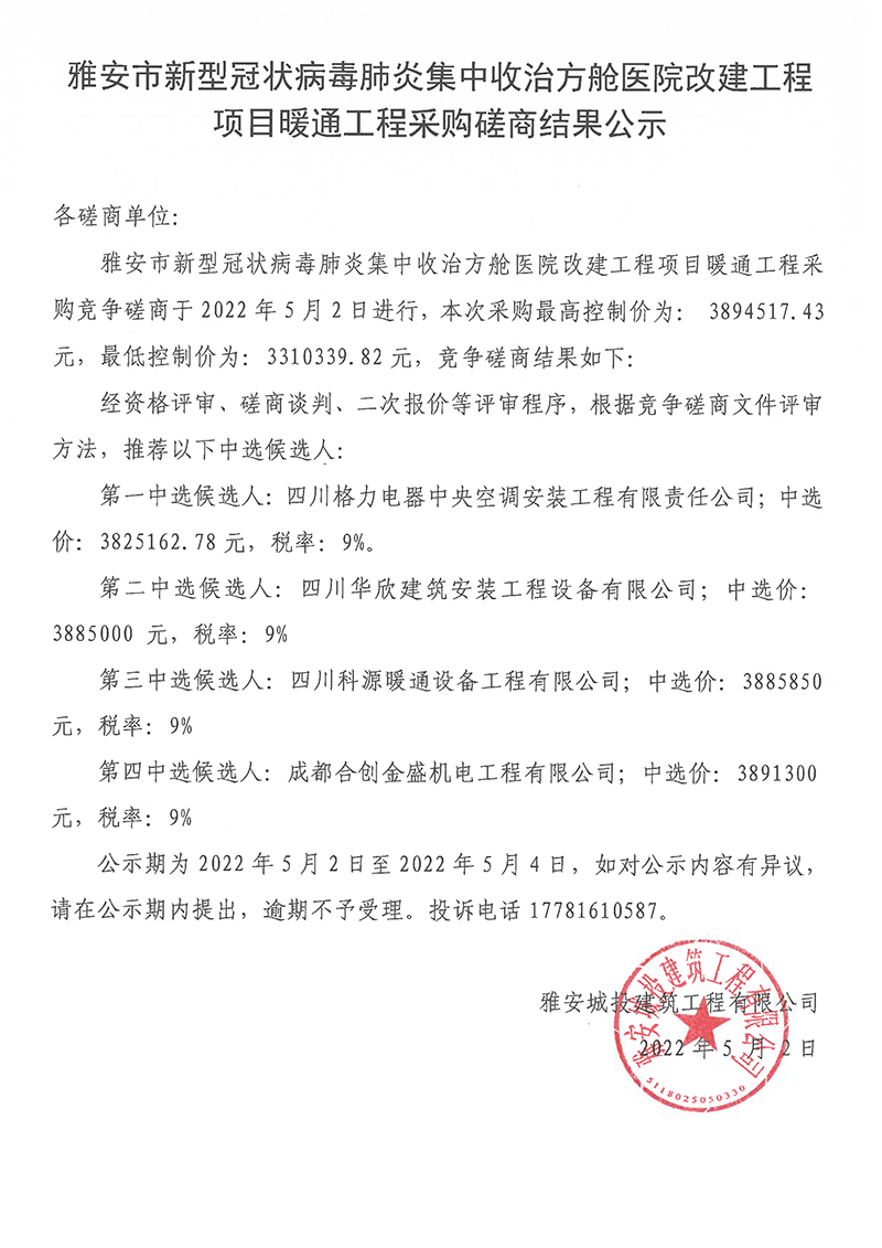 雅安市新型冠狀病毒肺炎集中收治方艙醫(yī)院改建工程項(xiàng)目暖通工程采購磋商結(jié)果公示