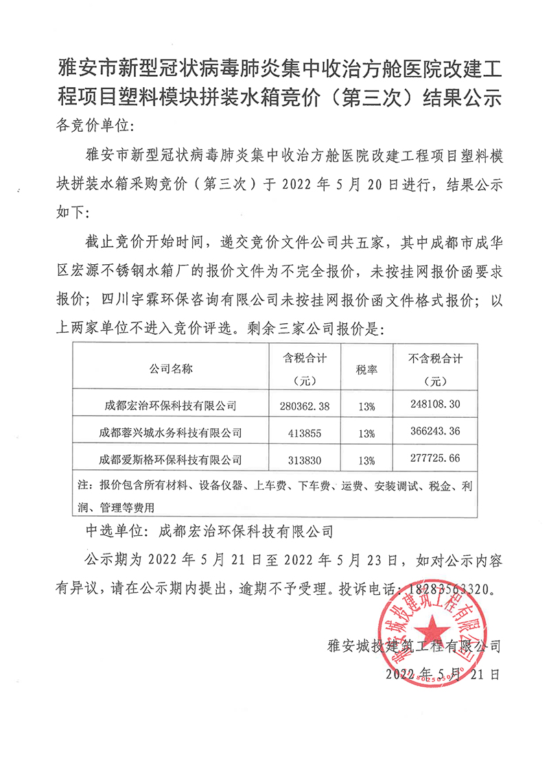 雅安市新型冠狀病毒肺炎集中收治方艙醫(yī)院改建工程項目塑料模塊拼裝水箱競價(第三次)結果公示