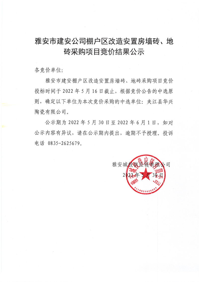 雅安市建安公司棚戶(hù)區(qū)改造安置房墻磚、地磚采購(gòu)競(jìng)價(jià)項(xiàng)目競(jìng)價(jià)結(jié)果公示