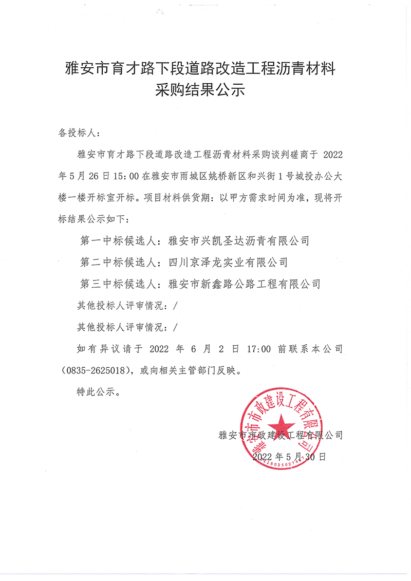 雅安市育才路下段道路改造工程瀝青材料采購結(jié)果公示