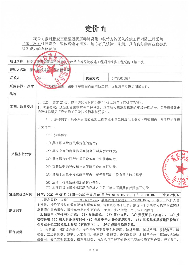 雅安市新型冠狀病毒肺炎集中收治方艙醫(yī)院改建工程項(xiàng)目消防工程競價(jià)公告(第二次)