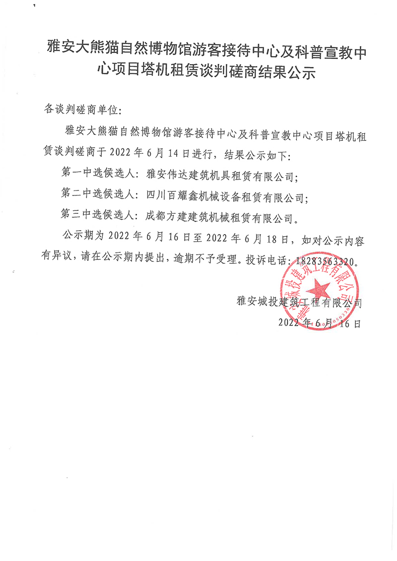 雅安大熊貓自然博物館游客接待中心及科普宣教中心項目塔機租賃談判磋商結果公示