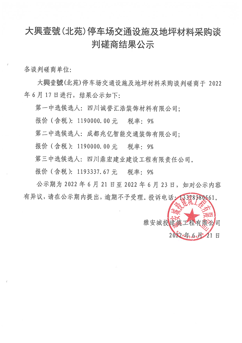 大興壹號(北苑)停車場交通設施及地坪材料采購談判磋商結果公示