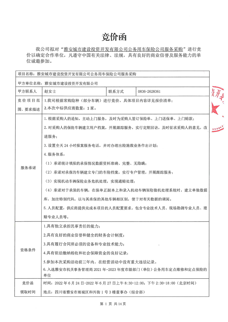 雅安城市建設投資開發(fā)有限公司公務用車保險公司服務采購競價公告