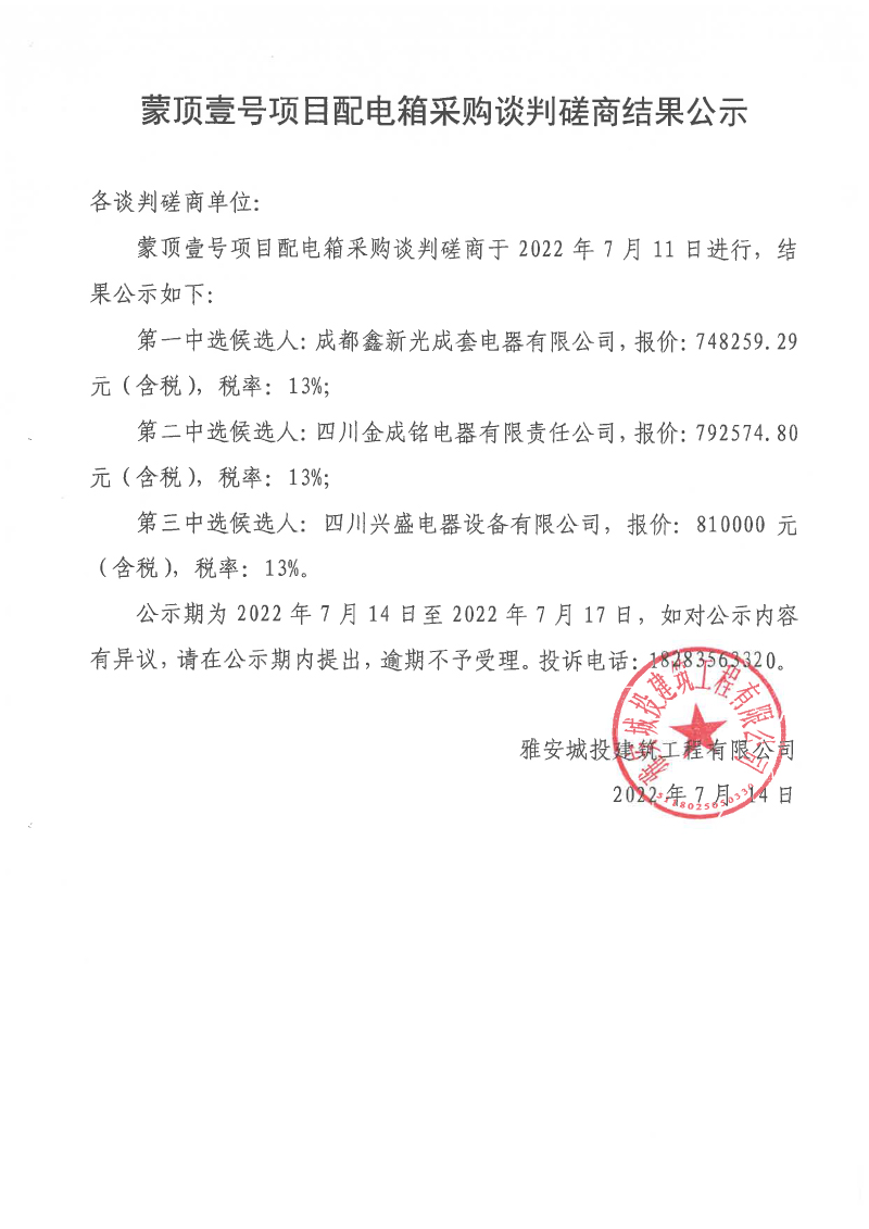 蒙頂壹號(hào)項(xiàng)目配電箱采購(gòu)談判磋商結(jié)果公示